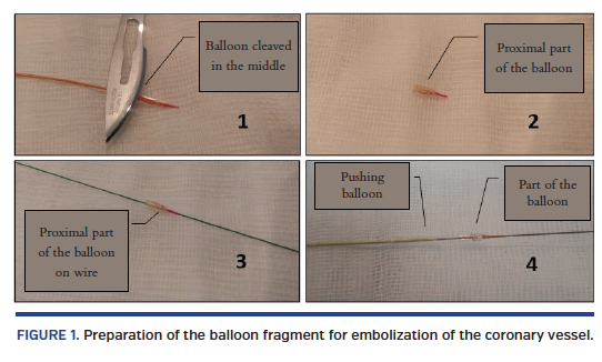 Abstract: Aims. Coronary artery perforation is a rare but potentially serious complication of percutaneous coronary intervention (PCI). Clinical manifestation and prognosis of patients depend on the severity of the complication, the occurrence of tamponade, and the methods of treatment. A special type of perforation is caused by damage to the distal segment of the coronary vessel by guidewire. This type of perforation is mostly connected with subacute clinical presentation. The treatment can be difficult, especially when prolonged balloon inflation is not efficient. The aim of the article is to present a balloon fragment technique as a treatment method for distal vessel perforation. Methods. The method of treating distal perforation, which we presented at EuroPCR 2019, involves embolization of a perforated vessel with a cut part of balloon catheter. Six patients are included in this registry; only 1 truncated proximal balloon fragment was enough to effectively embolize the perforated vessel in 4 patients, while 2 balloons were required in 1 patient and 3 balloons were required in 1 patient. Conclusion. Compared with other methods, this technique is an easy, cheap, and effective treatment for distal vessel perforation. The described method is available in every catheterization laboratory and does not require expensive equipment or exceptional operator experience.