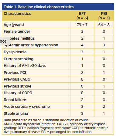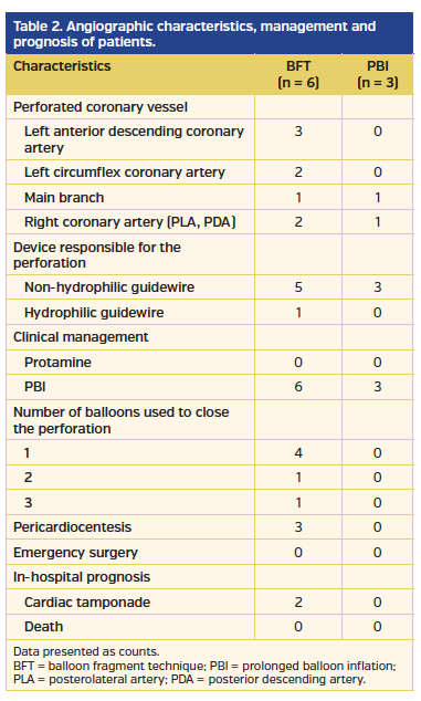 The baseline clinical characteristics and PCI data are shown in Table 1 and Table 2. In 4 cases, only 1 cut balloon per case was used to close the vessel. Three of the described cases were associated with tamponade and pericardiocentesis. No patient has died.