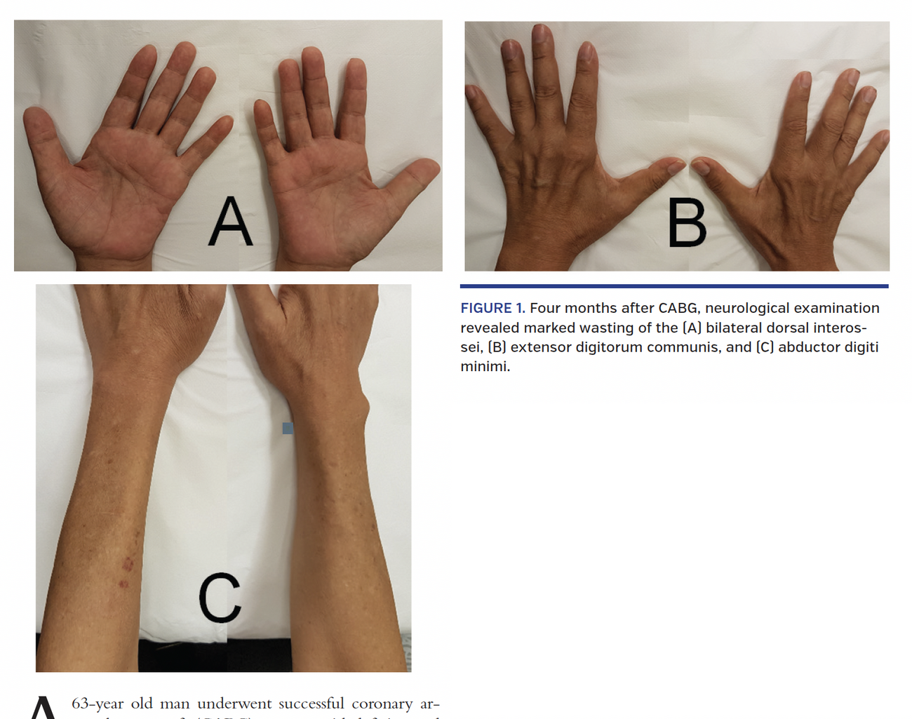 He continued to have progressive thinning of both forearms and hands. When seen 4 months later, neurological examination revealed marked wasting of bilateral dorsal interossei (Figure 1A), extensor digitorum communis (Figure 1B), and abductor digiti minimi (Figure 1C). Our case demonstrates the effects of bilateral brachial plexus injury secondary to traction and compression of nerve roots during sternotomy for CABG. Open surgical harvesting of LIMA is believed to increase the risk of injury to the brachial plexus. We believe that this approach probably aggravated the neurological damage in our patient. Proper positioning, thoracoscopic harvesting of LIMA, and avoiding prolonged and excessive traction on the rib cage could have reduced the risk of this injury.