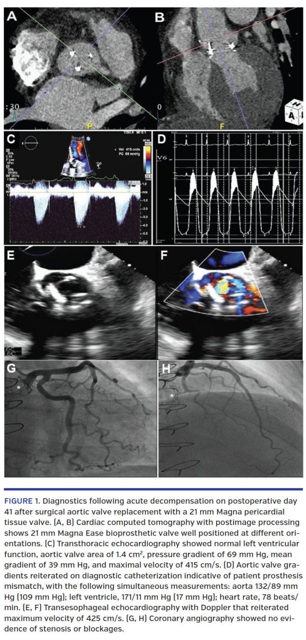 A 41-year-old Caucasian male (body mass index, 33.61 kg/m2; body surface area, 2.28 m2) was referred to our institution for evaluation of persistent symptoms of dyspnea, fatigue, and continuous chest discomfort. His history was notable for a bicuspid aortic valve with associated ascending aortic aortopathy; he had previously undergone a valve sparing root repair with a 26 mm Terumo aortic vascular graft 5 years prior. Four months prior to the current presentation, he presented with severe aortic insufficiency in the native valve; he underwent repeat open surgical procedure with AVR. Intraoperatively, extensive scar and calcification of the root made root enlargement problematic and the largest valve that could be placed was a 21 mm Magna Ease bioprosthetic valve (Edwards Lifesciences). His postoperative course was uneventful, and the patient was discharged on postoperative day 5. No echocardiogram was done in the immediate postoperative period.