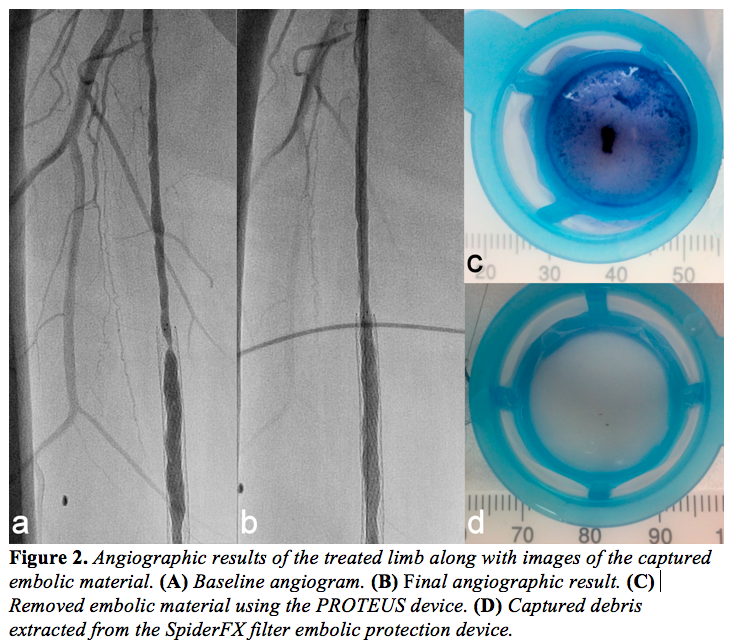 The frequency of peripheral embolic events, a consequence of PVI, has been grossly underestimated, leaving development and implementation of protection strategies to be further investigated. However, the need for distal protection during endovascular procedures is beginning to attract more attention, especially when treating high-risk patients with comorbidities. Microparticles as small as 0.015-0.1 mm have been proven clinically relevant,10 yet many easily bypass EPDs and require more effective capturing solutions. To date, standard EPDs are reported to prevent circulation of particles with a major axial dimension of 0.05 mm or more, yet are accompanied with clinical and financial limitations and are therefore sparingly used in the lower limbs. As shown here, the Proteus balloon offers a robust and cost-effective embolic capture and removal angioplasty platform for lower-limb indications.