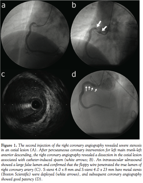 Discussion. Coronary angiography (CAG) is a very widespread and relatively safe procedure in the clinical practice of cardiology. Of the complications of CAG, catheter-induced coronary dissection is a rare but well-recognized life-threatening complication. In addition, bilateral coronary dissection is extremely rare. Numerous factors can contribute to increased risk for catheter-induced bilateral coronary dissection. Here we reported a case of catheter-induced bilateral coronary dissection in a patient on long-term steroid therapy that was successfully resolved by stenting. To the best of our knowledge, this is the first case of catheter-induced bilateral coronary dissection reported in the English literature.