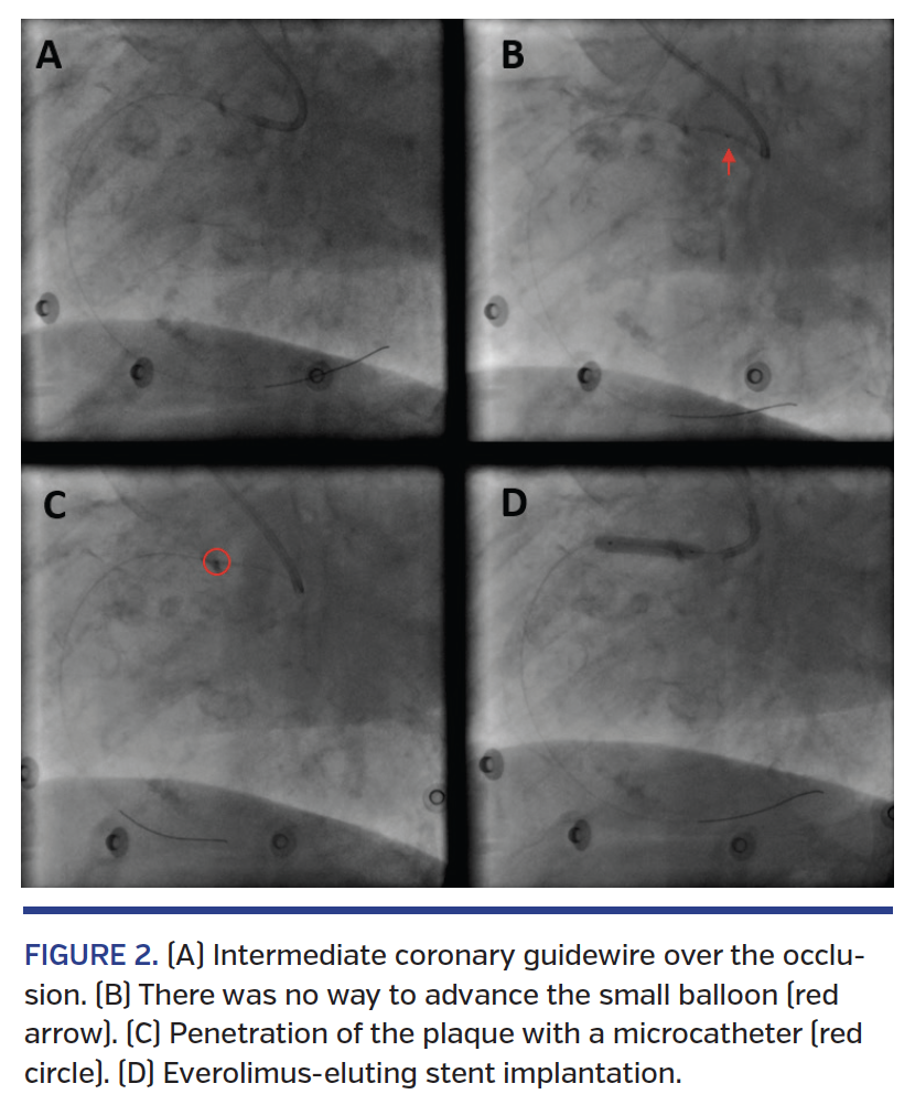 An 86-year-old woman was rescued by the emergency team for inferior ST-segment elevation myocardial infarction complicated by cardiogenic shock. Echocardiogram showed severe dilation of the right ventricle with compromise of its ejection function. Coronary angiography (right femoral artery access) showed heavily calcified plaque at the origin of the right coronary artery (RCA) with total ostial occlusion of the vessel (Figure 1) and TIMI 0 flow; there was no evidence of significant collateral circulation from the left coronary artery. After placement of a 6 Fr hockey-stick guiding catheter (HS2) in the right coronary sinus without selective engagement of the RCA ostium, we advanced an intermediate coronary guidewire over the occlusion (Figure 2A). There was no way to advance the 1.25 mm Tazuna balloon (Terumo) over the RCA ostium (Figure 2B). We opted to penetrate the plaque with a FineCross MG microcatheter (Terumo) (Figure 2C) to obtain enough space to perform coronary angioplasty. We then performed multiple inflations with semicompliant (from 1.25 to 2.0 mm) and non-compliant (from 2.5 to 4.0 mm) catheter balloons and implantation of a 4.5 x 18 mm everolimus-eluting stent (Figure 2D) in the RCA ostium. Good angiographic result showed evidence of developed RCA with great posterior descending artery (PDA) that extended beyond the heart apex (Video 1). The hemodynamic setting stabilized and the patient was transferred to the intensive care unit to continue monitoring.