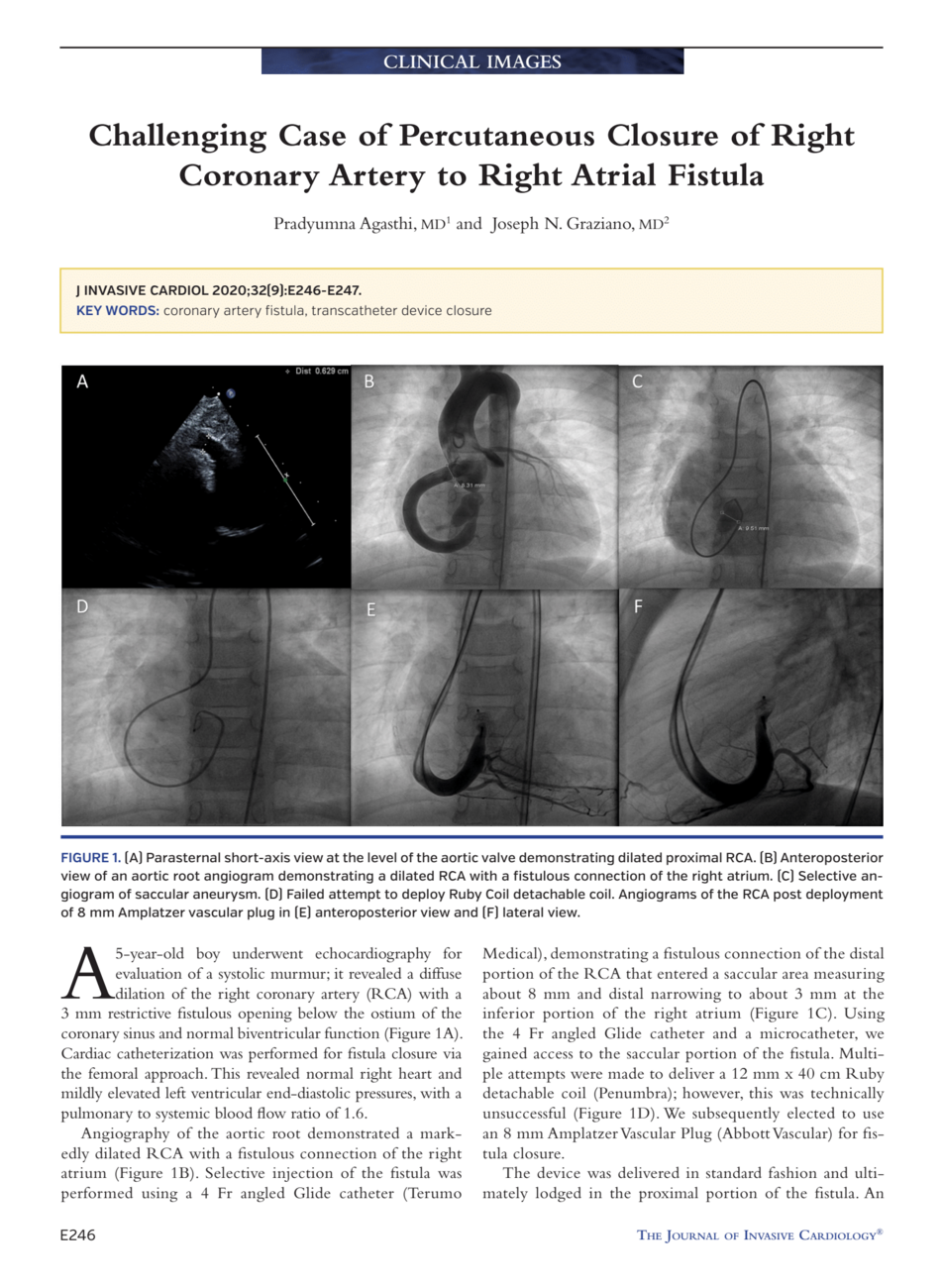 A 5-year-old boy underwent echocardiography for evaluation of a systolic murmur; it revealed a diffuse dilation of the right coronary artery (RCA) with a 3 mm restrictive fistulous opening below the ostium of the coronary sinus and normal biventricular function (Figure 1A). Cardiac catheterization was performed for fistula closure via the femoral approach. This revealed normal right heart and mildly elevated left ventricular end-diastolic pressures, with a pulmonary to systemic blood flow ratio of 1.6.
