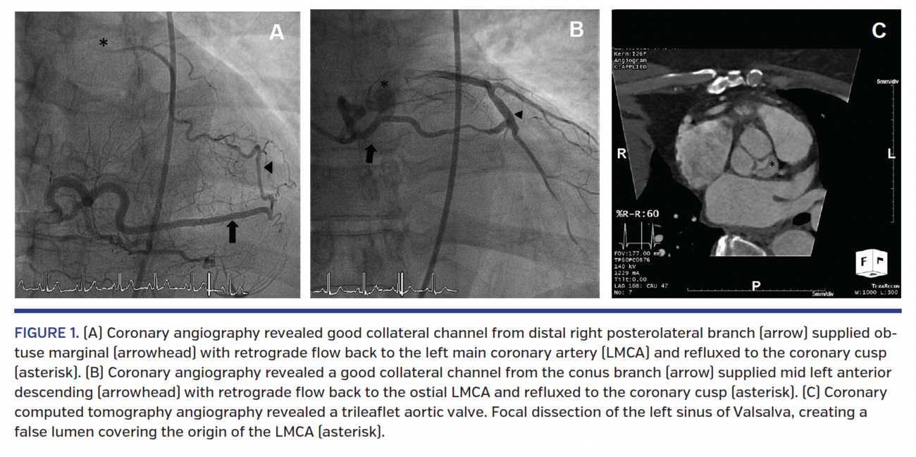 A 44-year-old woman with type 2 diabetes and hypertension was referred for coronary angiography after non-ST segment elevation myocardial infarction. Echocardiography demonstrated left ventricular ejection fraction of 61% with normal regional-wall motion and severe aortic regurgitation. We were unable to identify the left coronary artery. The right coronary artery origin was normal, with no stenosis. There was good collateral flow from the right posterolateral branch to the obtuse marginal branch (Figure 1A and Video 1). We accidentally engaged the right conus branch with an Amplatz left (AL) 0.75 diagnostic catheter. Angiography demonstrated good collateral flow from the conus branch to the mid left anterior descending artery with retrograde flow to the left main coronary artery (LMCA) and left coronary cusp (Figure 1B and Video 2). There was no stenosis in the LMCA. Coronary computed tomography angiography revealed a focal dissection flap in the left sinus of Valsalva, creating a false lumen covering the origin of the LMCA (Figure 1C). The intimal flap in the left coronary sinus was also attached to the left aortic leaflet, causing incomplete closure of the aortic valve.