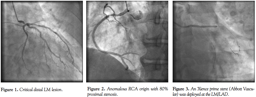 as a focal 80% stenosis at the distal left main (LM). The right coronary artery (RCA) had an anomalous origin arising from the anterior aortic wall and there was a 70% stenosis at its mid segment (Figures 1 and 2). The patient refused coronary artery bypass grafting as the treatment of choice. We then proceeded to coronary angioplasty. A 6 Fr Judkins left 3.5 guiding catheter (Medtronic) was placed in the left coronary artery (LCA) via the right radial approach. LAD, left circumflex (LCX) and ramus arteries were wired with
