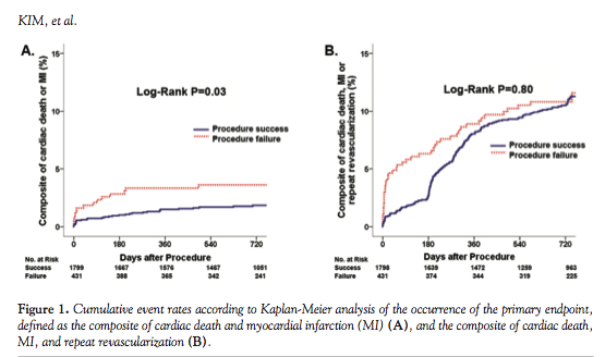 Abstract: Objectives. To investigate the impact of the success or failure of chronic total occlusion (CTO) interventions on the clinical outcomes in the current drug-eluting stent (DES) era. Background. The impact of the successful CTO intervention on long-term clinical outcomes still remains unclear. Methods. Between 2007 and 2009, a total of 2568 patients with CTO were followed in a multicenter Korean CTO registry. Of these, successful recanalization with DESs occurred in 2045 patients (successful CTO group), whereas failure occurred in 523 patients (failed CTO group). Results. The occurrence of the composite of cardiac death and myocardial infarction (MI) was compared between the successful CTO and failed CTO groups. During follow-up (median duration, 729 days), the occurrence of cardiac death or MI was significantly lower in the successful CTO group than in the failed CTO group (1.7% vs 3.3%; hazard ratio, 0.50; 95% confidence interval, 0.28-0.91; P=.02) and the cumulative occurrence in the successful CTO group was also significantly lower than in the failed CTO group (1.7% vs 3.0%; P=.03) by the Kaplan-Meier method. The successful CTO group had a significantly lower need for bypass surgery than the failed CTO group (0.2% vs 2.5%; P<.001). In multivariate analysis, procedural success of CTO (odds ratio, 0.51; 95% CI, 0.29-0.92) was significantly predictive of the occurrence of cardiac death or MI, together with age and left ventricular ejection fraction <40%. Conclusion. This registry study demonstrated that successful CTO intervention with DESs compared to failed CTO intervention was associated with lower event rates during follow-up.