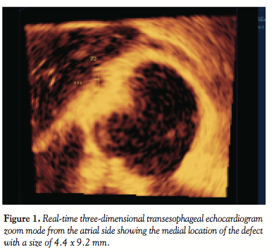 Real-time 3D TEE has been described for facilitated guidance of the closure procedure.3 However, recent publications did not focus on the sizing of the defect although it is a critical issue to prevent device embolization and secure complete closure of the defect. We present a case in which 3D TEE with off-line analysis was used for selection of the device size.