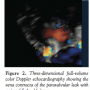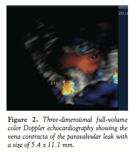 Although closure of paravalvular leaks with Amplatzer occluders after surgical valve replacement has been described in patients with increased perioperative risk, beneficial outcomes have not been consistently reported.1,2 Two-dimensional (2D) TEE has been shown to complement fluoroscopy for catheter-based closure, but it has technical limitations, in particular to identify the location and extent of the leak and to determine the spacial relationship of the intracardiac catheter to the paravalvular defect.