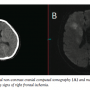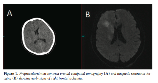 Case Report. A 56-year-old woman presented to our emergency department with acute left-sided hemiplegia and slurred speech. On physical examination, her heart rate was 82 beats/min, and blood pressure was 110/70 mm Hg. A 12-lead eletrocardiography showed normal sinus rhythm. She had a history of essential hypertension. Her National Institutes of Health Stroke Scale (NIHSS) score at admission was 22. She was admitted to hospital 3.5 hours after stroke onset. On physical examination, she was drowsy, with speech disorder, gaze deviation, and left hemiplegia with hemihypesthesia. A head computed tomography (CT)