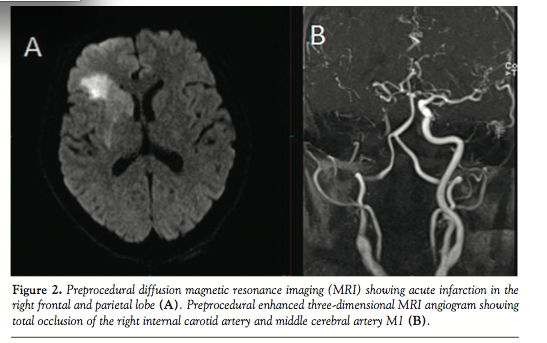 and magnetic resonance imaging (MRI) showed early ischemic signs of right frontal area (Figure 1). Diffusion MRI showed an acute infarction in the right frontal and parietal lobes (Figure 2A). Cervical enhanced MRI angiography showed that the right internal carotid artery was occluded and imaging of the 3-dimensional time-of-flight MR angiogram showed acute occlusion of the MCA M1 branch (Figure 2B). Immediate fibrinolytic therapy with alteplase was initiated. We planned to perform rescue endovascular treatment after failure of fibrinolytic therapy.