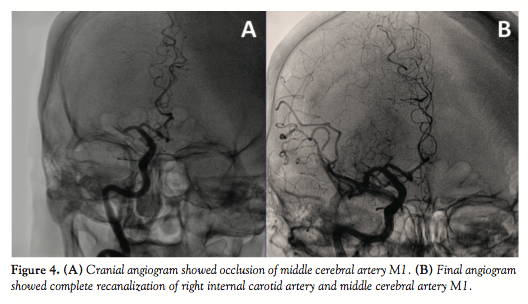 no sign of vascular damage or residual distal occlusion (Figure 4B). Total time between femoral access and arterial recanalization was 50 minutes. The patient’s neurological condition dramatically improved after the procedure. The NIHSS score improved to 0 points at discharge and modified Rankin score was 1 at 3-month follow-up exam.