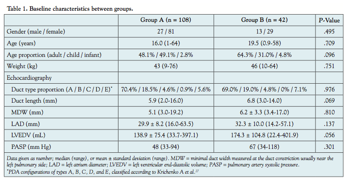 The exclusion criteria for PDA patients were: (1) any other cardiac comorbidity regardless of congenital conditions or acquired heart disease that necessitated surgical treatment; (2) significant cardiac and non-cardiac comorbidities that could have an effect on clinical outcome of duct closure; (3) right-to-left shunting caused by severe pulmonary hypertension; and (4) true window-type PDA.