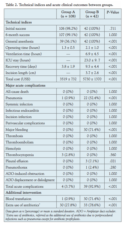 Abstract: Objective. This study compared the clinical outcome of the transvenous versus transthoracic approach for closure of patent ductus arteriosus (PDA). Background. There are no data regarding the results of transvenous versus transthoracic catheter-based device closure of PDA with Amplatzer duct occluder (ADO) despite their increasing use as alternatives to conventional surgery. Methods. In this observational study, a total of 150 consecutive patients with PDA were allocated either to the transvenous approach (group A, n = 108) and the transthoracic approach (group B, n = 42) by using ADO between January 2010 and April 2012. Echocardiography was performed to evaluate the prespecified initial and 6-month success of PDA closure. The technical indices and procedure-related major acute and chronic complications were documented. Results. There were similar initial success rates (98.2% vs 100%; P>.05) and 6-month success rates (99.1% vs 100%; P>.05) between groups, and group A had fewer major acute complications (3.7% vs 85.7%; P<.001), shorter operating time (1.3 hours vs 2.1 hours; P<.001), Intensive Care Unit stay (0 hours vs 23.0 hours; P<.001), and recovery time (3.8 days vs 9.5 days; P<.001), and lower rates of general anesthesia (36.1% vs 100%; P<.001), blood transfusion (0.9% vs 71.4%; P<.001), and extra use of antibiotics (27.8% vs 78.6%; P<.001), and lower total cost of hospitalization ($3815.78 vs $5730.21; P<.001). Conclusions. Despite similar efficacy for duct closure with ADO, transvenous approach was associated with fewer acute complications, more periprocedural comfort, and lower cost; thus, transthoracic approach should not be a reasonable choice for duct closure except for particular indications.