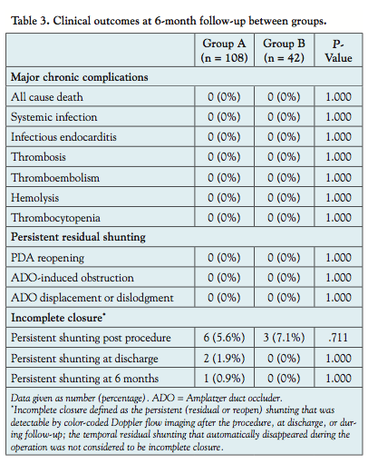 Postprocedural follow-up and 6-month outcomes. The postprocedural clinical follow-up was scheduled at 1 and 6 months. Thereafter, the follow-up was conducted yearly, with indexed echocardiography at 1 and 6 months, to record all clinical-cause death, infectious endocarditis, thrombosis and/or thromboembolism, hemolysis, and thrombocytopenia. The follow-up was intended to determine incomplete duct closure (caused by persistent residual shunting or PDA reopening), the ADO-induced obstruction at the sides of the aortic arch and/or the left pulmonary and ADO displacement or dislodgment, as well as to echocardiographically monitor the residual shunting and its related changes.