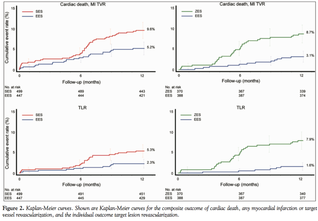 Statistical analysis. Results are reported according to the EES/SES arm or EES/ZES arm, the same EES patients are not used for comparison with SES or ZES. Categorical variables were reported as counts and percentages, and continuous variables as means and standard deviations (SD) or median and interquartile ranges (IQR). Cumulative event rates were estimated using the Kaplan-Meier method and compared with the log-rank test. Hazard ratios were calculated with Cox proportional-hazards models. Follow-up was censored at the last known date of follow-up or at 12 months, whichever came first. A P-value <.05 was deemed significant.