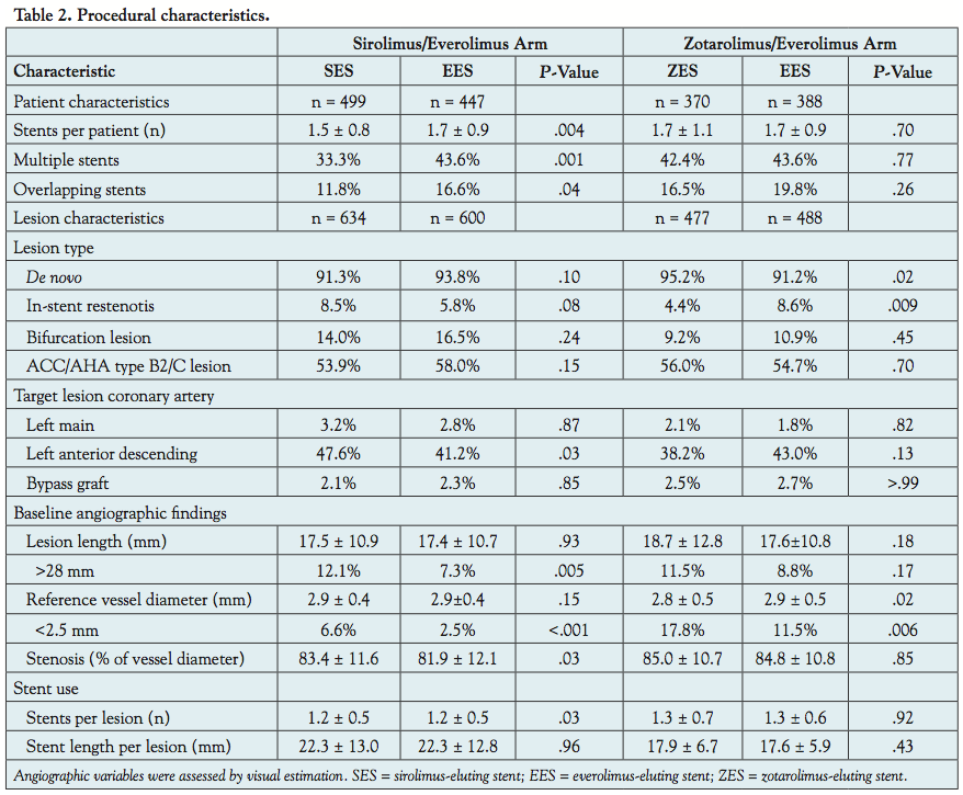Patients in the EES/ZES arm were generally comparable, although patients treated with an EES more often had a history of previous PCI. Significantly fewer patients were treated with an EES for small diameter lesions (<2.5 mm; P=.006), but were treated more frequently for an in-stent restenosis (8.6% vs 4.4% in the ZES group; P=.009).