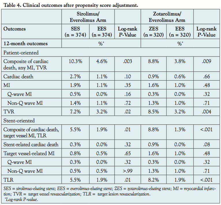 In conclusion, the 12-month outcomes of the PROENCY registry show a reduced incidence of the composite of cardiac death, MI, and TVR with EES compared with SES or ZES. This was mainly driven by a reduction in TLR.
