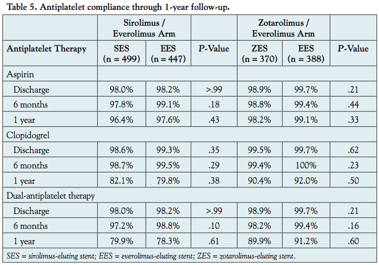 Antiplatelet therapy. No differences were observed in aspirin, clopidogrel or dual-antiplatelet therapy compliance between EES and SES or EES and ZES patients through 1-year follow-up (Table 5).