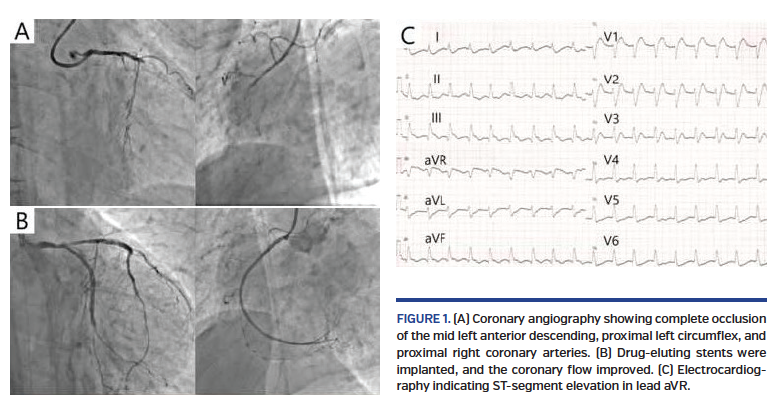 A 65-year-old woman with smoking and hypertension history presented to the emergency department with cardiogenic shock. Acute myocardial infarction (AMI) was diagnosed based on echocardiography, laboratory data (creatine kinase, 244 IU/L), and electrocardiography that indicated ST-segment elevation in lead aVR (Figure 1C), suggesting myocardial infarction caused by multivessel or left main trunk coronary artery disease. Emergency coronary angiography revealed completely occluded mid left anterior descending coronary, proximal left circumflex, and proximal right coronary arteries (Figure 1A). Percutaneous coronary intervention (PCI) was performed with intra-aortic balloon pump support; the floppy guidewire could easily pass through each occlusion, suggesting simultaneous acute occlusion of the three major coronary arteries (SAOT). Moreover, drug-eluting stents were implanted, which improved the coronary flow and stabilized hemodynamics, particularly after complete revascularization (Figure 1B). Although post-PCI laboratory tests showed elevated creatine kinase level (18,000 IU/L) and accompanying severe heart failure, the patient recovered and was discharged 61 days later. Considering the mild elevation in creatine kinase level at admission, this patient fortunately presented to the hospital immediately after the onset of symptoms. AMI caused by SAOT is rarely reported because such severe ischemia can lead to sudden cardiac death. Thus, our case demonstrates that rapid and complete revascularization by PCI can be used to save a patient in such cases.