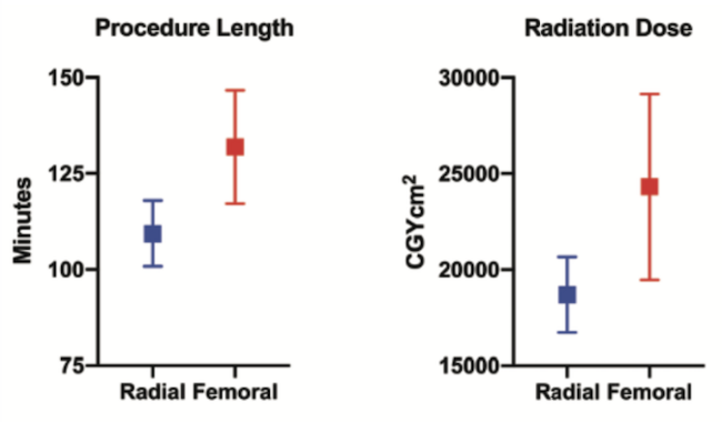 Figure 2 highlights the differences seen in procedure length, radiation exposure, and contrast dose. The time taken to complete the procedure was less in the radial group (109.4 ± 44.8 minutes in radial vs 131.9 ± 46.9 minutes in femoral; P<.01) and required lower doses of radiation (dose area product, 18,694 ± 10,381 cGy•cm² in the radial group vs 24,314 ± 15,357 cGy•cm² in the femoral group; P<.01). Although less contrast was required (277.9 ± 133 mL in the radial group vs 315.7 ± 122.4 mL in the femoral group; P=.11), this did not reach statistical significance. Moreover, the radial group had a significantly shorter length of in-hospital stay (0.38 ± 1.3 days in the radial group vs 0.61 ± 1.1 days in the femoral group; P=.02).