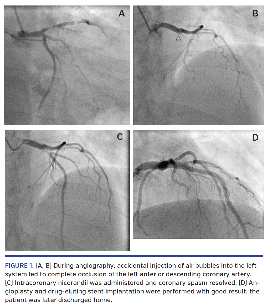 A 55-year-old male was admitted to the cardiology unit with anterior-wall myocardial infarction and post-infarct angina. He was a known smoker and hypertensive. A coronary angiography was planned; during angiography, the left coronary artery was selectively engaged with a 6 Fr Judkins left 3.5 diagnostic catheter and a cineangiography shot was taken. However, accidental injection of air bubbles into the left system led to total abrupt occlusion of the left anterior descending coronary artery (Figures 1A and 1B; Videos 1 and 2). The electrocardiography tracing revealed new ST-segment elevation in the anterior leads and the patient complained of chest pain. Immediate intracoronary nicorandil was administered and the guidewire passed, with 100% oxygen started via nasal cannula. The coronary spasm resolved with these interventions (Figure 1C). Angioplasty of the proximal diseased segment was performed with drug-eluting stent implantation and the patient was discharged later in stable condition (Figure 1D).