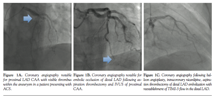 Many clinical questions remain regarding the management of CAA, particularly in the setting of ACS. First, the chronicity of thrombus visualized angiographically within CAA may be difficult to discern. As highlighted in Case 2, the patient presented with ACS despite chronic systemic anticoagulation and antiplatelet therapy, making acute thrombosis less likely. It was thus unclear if the clinical presentation represented classic “plaque rupture” in ACS, or alternatively, embolization of chronic thrombus from CAA provoking myocardial injury. In a post mortem study, Daoud et al reported the presence of thrombus in 7 of 10 patients with CAA,15 suggesting that chronic thrombosis may be common.