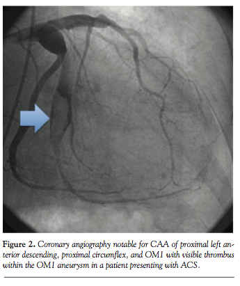 Several case reports have highlighted various medical strategies that were successful in the management of individual patients with CAA thrombosis. Myler et al described a case of successful treatment of CAA with intracoronary urokinase, IV heparin, and oral anticoagulation in a young woman with CAA secondary to presumed Kawasaki disease.16 Other authors have documented angiographic thrombus resolution and excellent clinical outcomes with the use of intravenous eptifibatide, heparin, and aspirin and discharge with long-term dual-antiplatelet therapy.17 Lima et al reported two cases of left main CAA that were treated non-surgically with warfarin and aspirin who remained well at 6-month follow-up exam.18 To date, however, no peer-reviewed or consensus document addressing the acute or long-term medical management of CAA with ACS exists.