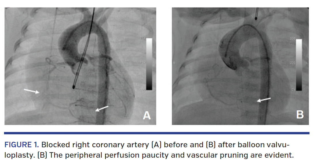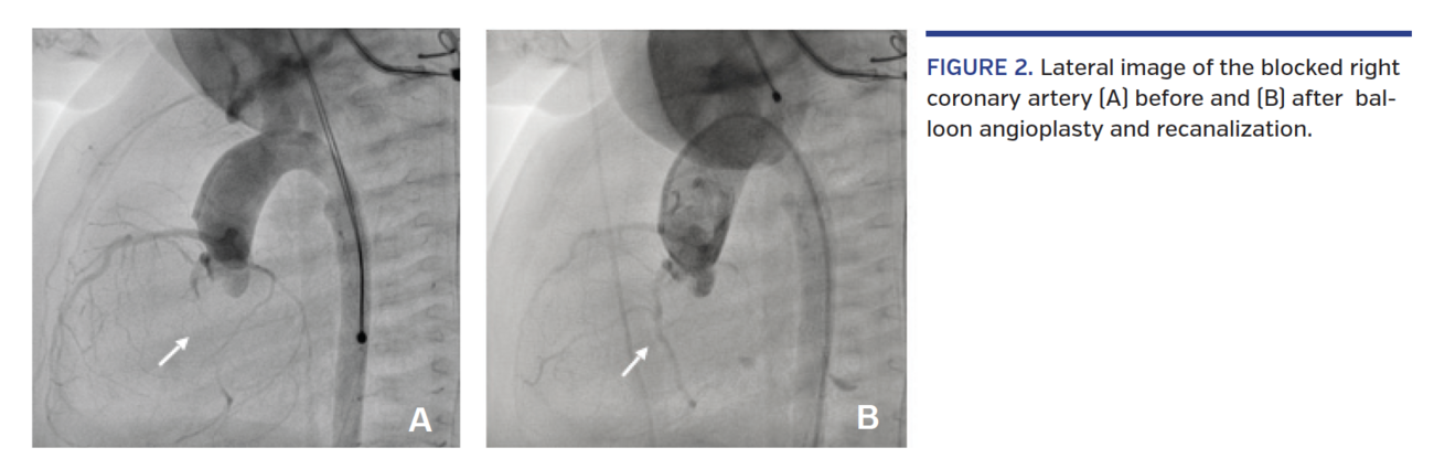 A 5-day-old term baby (weight, 3.5 kg) was transferred by air to our unit due to critical aortic stenosis (AS). Echocardiography showed severe left ventricular (LV) function impairment with diffuse LV hypokinesia and ejection fraction of 13%. The left atrium was moderately enlarged. The AS peak gradient was 70 mm Hg due to cusp fusion between the right and left coronary cusps. The newborn was taken to the cath lab, where right femoral artery access was easily obtained followed by heparin bolus of 50 IU/kg. Angiography of the ascending aorta showed a dysplastic, doom-shaped aortic valve with a negative flow jet toward the right anterolateral aortic wall and right coronary artery (RCA) occlusion at its mid segment, with its peripheral part reconstituted by collateral vessels from the left coronary artery connecting with the posterior descending artery (Figures 1A and 2A). Due to low systolic blood pressure (45 mm Hg) despite inotropic support with dopamine infusion, it was decided to proceed immediately with valvuloplasty and deal with the coronary occlusion afterward. During routine pre-valvuloplasty testing with pacing at 180 bpm, the patient developed ventricular fibrillation and was successfully cardioverted. Aortic valve annulus measured 7 mm; hence, balloon valvuloplasty followed, using a 7 x 2 Tyshak mini balloon catheter (B. Braun) with rapid pacing at 150 bpm. Disappearance of the balloon waist was noted and final hemodynamic peak gradient measured 15 mm Hg with no aortic regurgitation as seen on the repeat aortic angiogram. Interestingly, the angiogram also showed completely restored RCA perfusion, but acute pruning of the distal coronary network, implying embolization of the thrombus distally (Figure 1B).