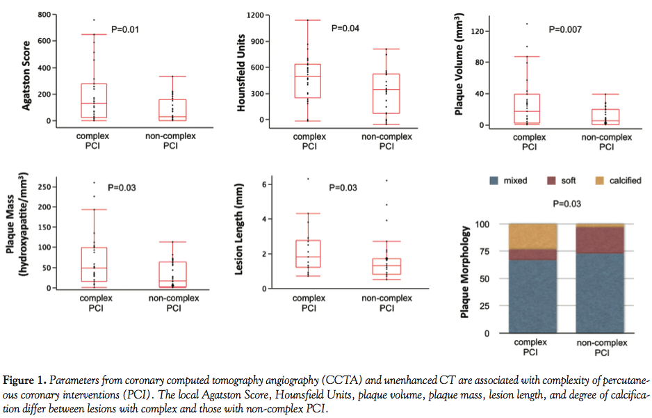 Abstract: Background. Coronary computed tomography angiography (CCTA) provides information regarding lesion morphology and three-dimensional coronary anatomy incremental to coronary angiography. We addressed the question whether preprocedural CCTA bears potential for guiding percutaneous coronary interventions (PCI). Methods and Results. Sixty-six coronary lesions attempted with PCI within 6 months of preprocedural CCTA were retrospectively assessed. Lesion parameters from unenhanced computed tomography (CT) for calcium scoring and CCTA were analyzed and compared with PCI complexity. Complex PCI was defined as use of buddy wire, kissing balloon, necessity of high pressure balloons, or rotablator. Complex PCIs were observed in 32 interventions (48%). Median Agatston score and Hounsfield Units were higher in lesions with complex as compared to those with non-complex interventions with 130 (interquartile range, 23-276) vs 29 (0-158; P=.01), and 493 (245-631) vs 341 (68-520 Hounsfield Units; P=.04), respectively. Median local plaque volume and plaque mass were higher in complex PCI with 17 (2-39) vs 5 (0-19.5 mm3; P=.007), and 48 (15-99) vs. 16 (1.5-63 mg hydroxyapatite/mm3; P=.03), respectively. Lesions leading to complex PCI were longer [1.8 (1.2-2.8) vs 1.3 (0.8-1.7) cm; P=.03], and had a higher rate of calcified plaques (23% vs 3%; P=.03). There was a significant correlation between CCTA- and angiography-derived local SYNTAX Scores (P<.001); the CCTA-derived score seems to be predictive for failed and complex PCI (area under the curve = 0.75 ± 0.13 and 0.66 ± 0.08, respectively). Conclusions. Preprocedural lesion assessment by CCTA indicates complexity of PCI. In patients with suspected complex coronary anatomy, prior CCTA adds important information for planning PCI.