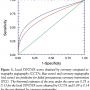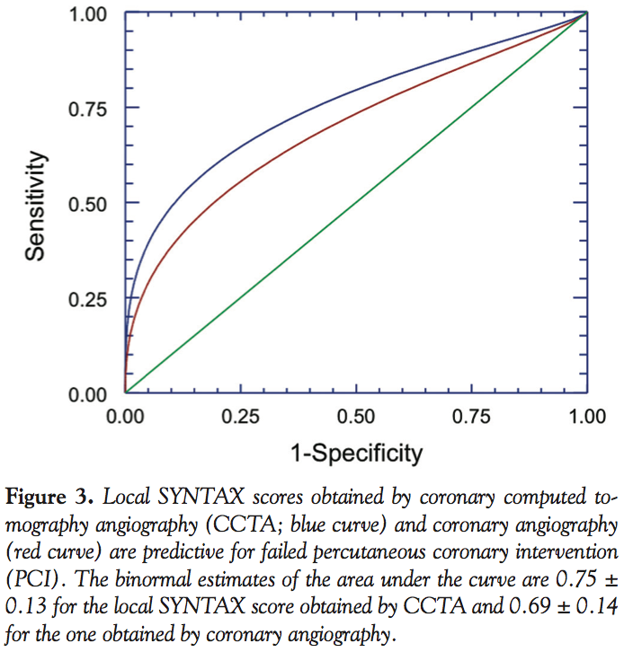 CCTA-derived local SYNTAX scores seem to be predictive for failed PCI with an area under the curve (AUC) ± standard error of 0.75 ± 0.13 in ROC analysis (Figure 3), and an intercept of 3.85 ± 1.06 (slope -0.17 ± 0.08; P=.04) assuming a logistic regression. At a CCTA-derived SYNTAX score cut-off value of 10, sensitivity was 0.66 and specifity was 0.74 for failed PCI; at an angiography-derived local SYNTAX score cut-off value of 9, sensitivity was 0.59 and specificity was 0.71, respectively (AUC = 0.69 ± 0.14; Figure 3). CCTA-derived local SYNTAX scores were less predictive of complex PCI with an AUC of 0.66 ± 0.08 in ROC analysis (cut-off value = 9, sensitivity = 0.50 and specificity = 0.82, respectively), and an intercept of 0.98 ± 0.50 (slope of -0.11 ± 0.06; P=.05) assuming a logistic regression. CCTA-derived local SYNTAX scores were not useful in predicting procedure-related complications (AUC = 0.42 ± 0.9).