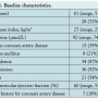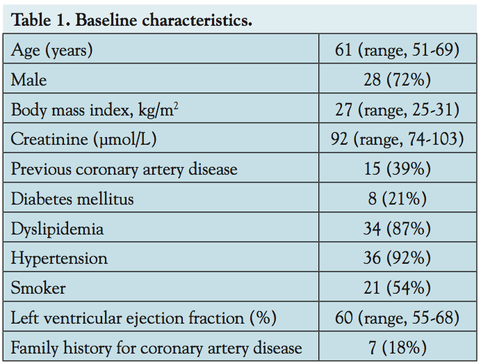 Baseline characteristics. Median age of the patients (72% male) was 61 years (range, 51-69 years). Risk factors for CAD were frequently observed: 21% of the patients suffered from diabetes, 87% had dyslipidemia, and 92% had hypertension. A total of 54% were smoking or had a history of tobacco use. Baseline characteristics are shown in Table 1.