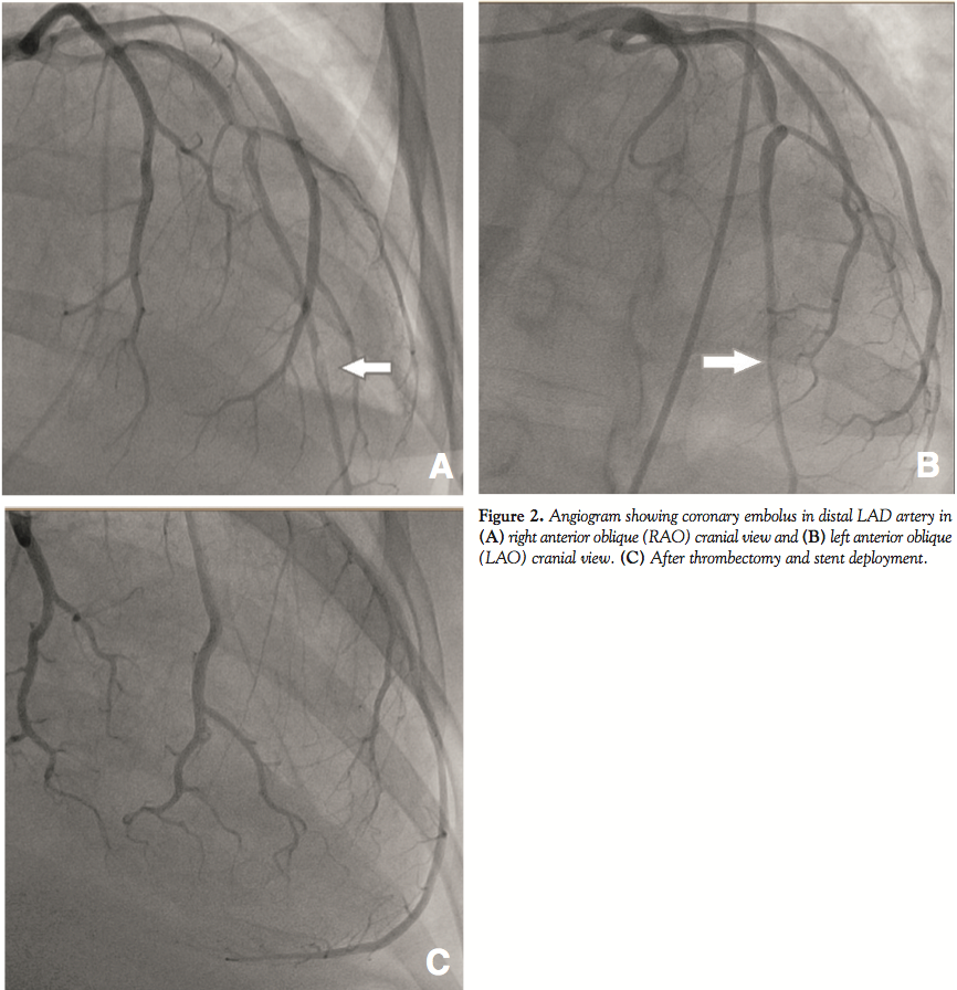 PPCM is a potentially life-threatening condition, defined as a new onset heart failure between the last month of pregnancy and the first 5 months of the postpartum period;4 absence of identifiable cause for the heart failure or pre-existing heart disease prior to the last month of pregnancy, essentially established by echocardiographic finding of left ventricular dysfunction.1,5 Although considered idiopathic, proposed mechanisms suggest unbalanced oxidative stress and a cardiotoxic Prolactin molecule as key players in the pathophysiology of this disease.6 The incidence of PPCM ranges from 1:1000 to 1:4000 live births, and it affects 1000 to 1300 women in the United States each year.7,8 PPCM is associated with a high maternal morbidity and mortality, reportedly accounting for 4% of maternal deaths in the United States.5,9 African-American race, advanced maternal age (>30 years old), twin pregnancy, use of tocolytics, gestational hypertension, and obesity are well-reported risk factors of PPCM.6,7,10 Thromboembolism, although a known complication, is an unusual initial presentation for PPCM,11-14 and yet is interestingly more frequent than those of dilated cardiomyopathy.15 The occurrence of thromboembolism in PPCM may be due to the nature of hypercoagulable state in pregnant individuals brought upon by the increased concentrations of coagulation factors VII, VIII, X, and plasma fibrinogen, as well as enhanced platelet adhesiveness from late pregnancy to 4–6 weeks postpartum.7,10 In addition, the left ventricular dysfunction in PPCM facilitates thrombus formation by causing relative blood stasis in the ventricles.14 Embolism in PPCM has been reported as a cause of blindness, pulmonary embolism, limb ischemia, stroke, as well as mesenteric and visceral ischemia.6 However, in our case, we describe a very rare event where a coronary embolus is arising from left ventricular mural thrombi, setting off an acute myocardial ischemia and infarction. We know of 2 reported cases of such emboli.2,3 Reperfusion with eptifibatide (glycoprotein IIb/IIIa inhibitor) was associated with improvement in flow acutely in one of the cases, yet with persistent heart failure state on long term and the patient required a heart transplant. Our case further verifies this mechanism as a cause of myocardial infarction in the disease process. We believe our case to be the first to describe thrombectomy and coronary intervention as a treatment for this rare condition in the acute setting. Of note, our patient had no chest pain as a presenting symptom, which further demonstrates the discrepancy between symptoms and disease process manifested in PPCM.