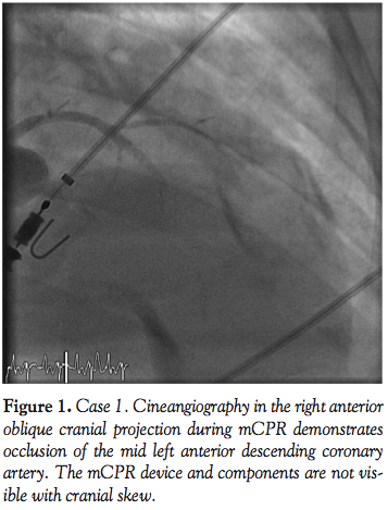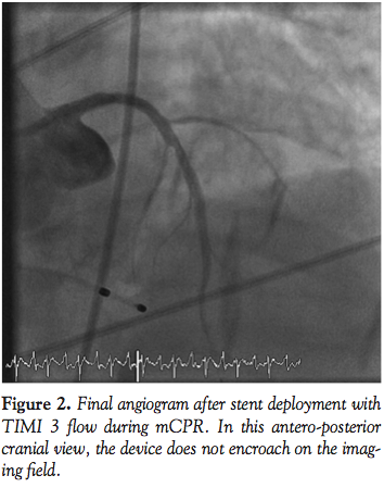 epinephrine and atropine before her pulse was restored. She suffered recurrent cardiac arrest in the CCL and resuscitation efforts were initiated with CPR, epinephrine, and atropine. The LUCAS device was placed and mCPR commenced. An IABP was placed via the right femoral approach and a temporary transvenous pacemaker placed via the right femoral vein. Angiography was performed via left femoral access during mechanical CPR. Her mid LAD was occluded with TIMI 0 flow (Figure 1). Balloon angioplasty was performed promptly with rapid restoration of TIMI 3 flow and placement of a bare-metal stent in the mid LAD (Figure 2). The semi-radiolucent LUCAS device was not visible on coronary angiography or during PCI in a steep right anterior oblique cranial projection. Despite maximal support with an IABP and multiple vasopressors, the patient manifested no significant myocardial function and expired in the catheterization laboratory after mCPR was discontinued.