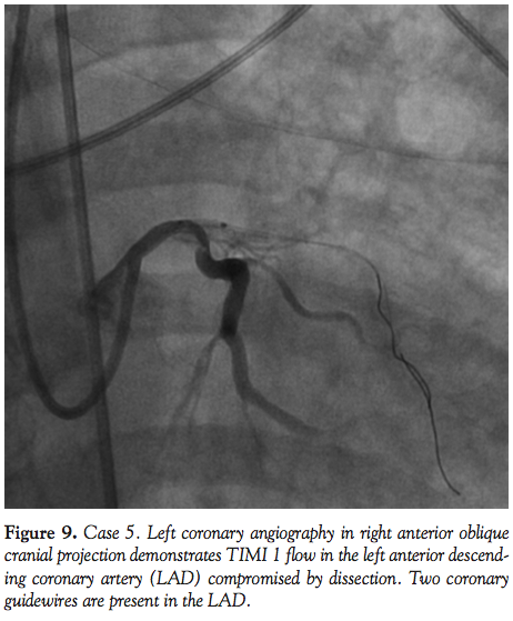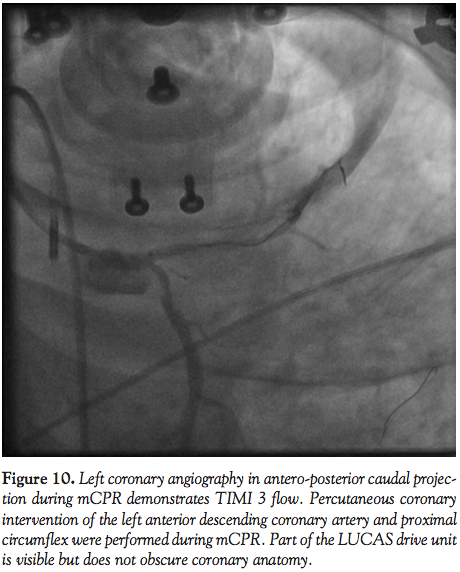 LAD (Figure 9). The patient suffered cardiac arrest with recurrent ventricular fibrillation requiring defibrillation 15 times. Mechanical CPR was initiated and continued during 30 minutes of persistent cardiac arrest while an IABP was placed and PCI of the LAD and circumflex were performed (Figure 10). TIMI 3 flow was achieved after placing 2 drug-eluting stents from the proximal to mid LAD and an additional stent in the circumflex. The patient regained spontaneous circulation with minimal pressor support and she was transferred to the CCU. Her condition improved and both the vasopressor and IABP were discontinued the following day. On hospital day 4, the patient was discharged home without any sequelae.