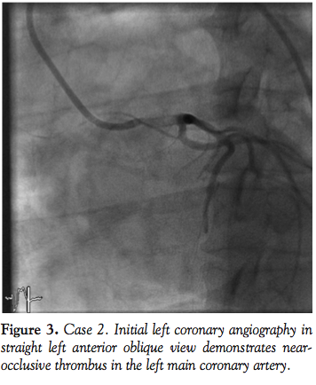 her initial systolic central blood pressure was 50 mm Hg. Left coronary angiography demonstrated occlusive thrombus extending across the length of the left main coronary artery with only TIMI 2 distal flow and minimal movement of the cardiac silhouette (Figure 3). As her hemodynamics continued to deteriorate, manual guide catheter aspiration and guidewire manipulation dislodged the thrombus with minimal thromboembolism to the apical LAD (Figure 4). Her cardiac motion on fluoroscopy