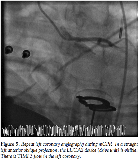 Wagner et al have published a series of patients receiving mCPR using the LUCAS device in the catheterization laboratory.14 Their disappointing patient outcomes reflect the reality of treating cardiac arrest patients acutely in the CCL. Nonetheless, all catheterization laboratories that routinely perform primary PCI will treat patients in this condition, and mCPR serves as a valuable tool. The LUCAS device is easy to operate and coronary imaging and intervention can be performed without significant limitations. This report details 4 patients experiencing cardiac arrest in the setting of acute ST-elevation myocardial infarction (STEMI) and 1 during elective PCI, and it provides images and discussion of coronary angiography and PCI during mCPR.