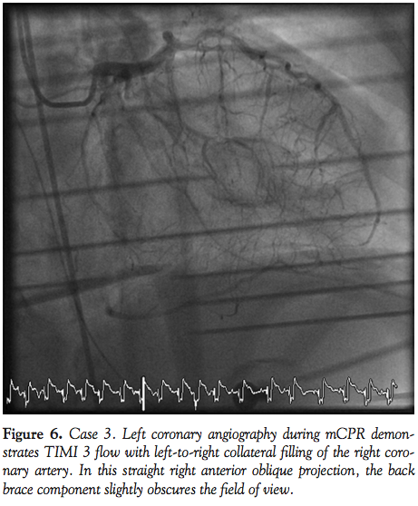 In animal models, cerebral blood flow during CPR is improved with mCPR,15 and mCPR devices provide significantly higher coronary perfusion pressures than manual CPR.16 Coronary flow assessment has been reported in both animal models and human subjects.16,17 In 4 out of 6 patients studied by Larsen et al with TIMI 3 flow during mCPR, invasive measurements documented adequate coronary perfusion pressure gradients. In the present experience, coronary flow during mCPR is pulsatile, but classification by TIMI grade is readily apparent. In Cases 1, 4, and 5, the PCI procedure itself was performed during mCPR compressions (Figures 1, 2, 8, and 10).