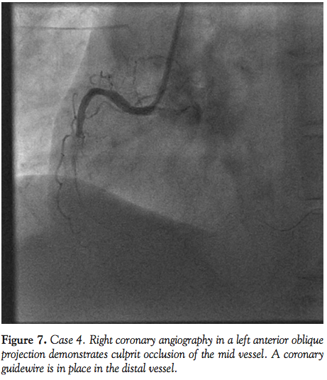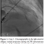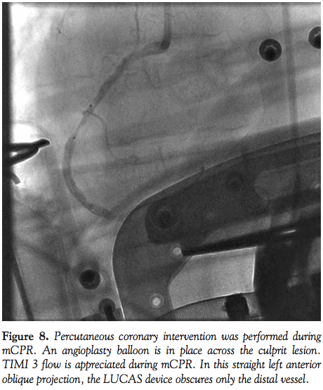 manual CPR and was intubated. Coronary angiography demonstrated a thrombotic culprit mid RCA occlusion (Figure 7). PTCA was performed during continuous mCPR (Figure 8) with subsequent ROSC. A bare-metal stent was placed in the mid RCA with restoration of TIMI 3 flow. An IABP was placed following left coronary angiography and the patient was transferred to the CCU on vasopressors. Despite increasing pressor support, the patient expired 12 hours later with a progressive sepsis-like syndrome.