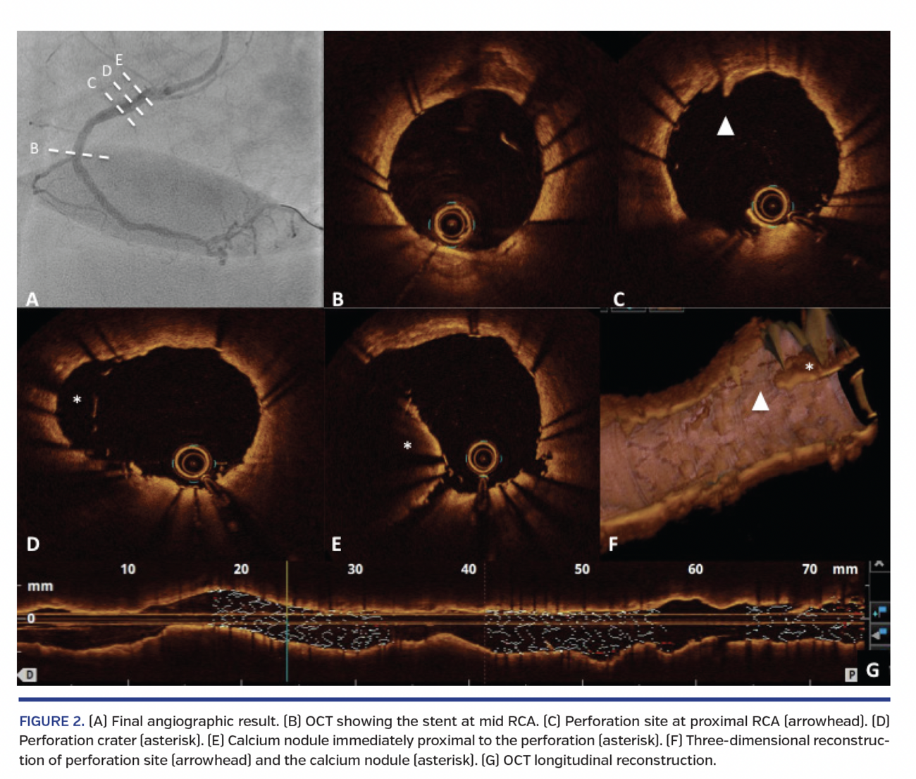 Percutaneous coronary intervention of 3 severely calcified lesions in the right coronary artery (RCA) (Figure 1A) was performed with excimer laser coronary angioplasty (ELCA; 0.9 mm, Spectranetics) using saline injection, fluence at 80 mJ/mm2, and frequency at 80 Hz (Figure 1B). Subsequently, an Ellis I perforation was observed at the proximal RCA (Figure 1C), with immediate progression to Ellis III (Figure 1D). Prolonged balloon inflation (Figure 1E) and drug-eluting stent implantation (Figure 1F) sealed the perforation. Afterward, two drug-eluting stents were successfully implanted at distal lesions (Figure 2A). Optical coherence tomography (OCT) confirmed the result of these stents (Figures 2B-2G) and depicted the perforation site (Figures 2C and 2F), the crater (Figure 2D), and a calcium nodule proximal to the perforation (Figures 2E and 2F).