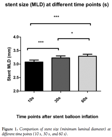 Mean stent sizes at each time point are shown in Table 1. Measured stent size increased significantly between each time point, with the most marked difference observed between 10 s and 30 s (P<.0001) and between 10 s and 60 s inflation (P<.0001). The difference between 30 s and 60 s was also, however, significant (P=.0034) (Figure 1).
