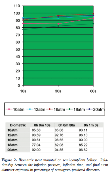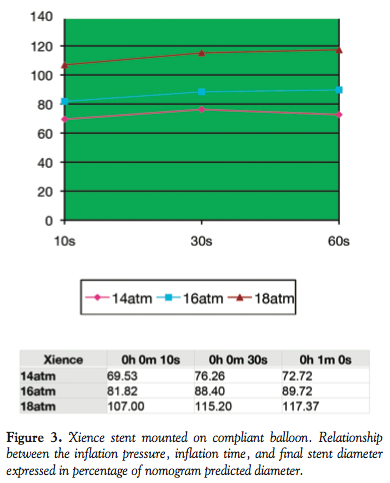 In both stent groups, the 60 s inflation resulted in approximately 80% SER as opposed to approximately 70% with the 20 s inflation. In our work, the stents reached 88.2 ± 11.5% of the nomogram-predicted diameter at 10 s and 95.3 ± 11.4% at 60 s; however, our work did not take into account the acute stent recoil, which is one of the denominators of the final stent diameter.8,9