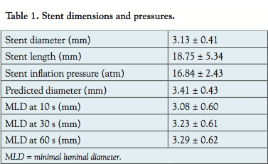 Statistical analysis. All values are given as mean ± standard deviation unless otherwise indicated. Comparison between stent diameters was made using a paired t-test or repeated measures one-way ANOVA when three or more groups were compared, in which case the Bonferroni correction was performed. All sample values conformed to a Gaussian distribution, as assessed by a Kolgmogorov-Smirnov test. P<.05 was considered significant. Prism version 5 (GraphPad Software, Inc) was used for all analyses.