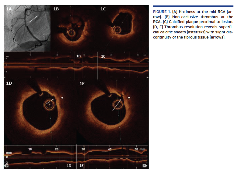 We present the case of a 63-year-old woman, former smoker, transferred to the catheterization laboratory for primary percutaneous coronary intervention in the midst of anterior ST-segment elevation myocardial infarction. Coronary angiography showed acute total occlusion of the proximal left anterior descending (LAD) (Video 1). After the guidewire passed through the distal LAD, TIMI-3 flow revealed severe proximal stenosis, which was treated with an everolimus-eluting stent with good outcome (Video 2). Afterward, angiographic haziness was recognized at the mid right coronary artery (RCA) (Figure 1A). Optical coherence tomography (OCT) exhibited non-occlusive thrombus (Figure 1B) and calcified plaques were observed proximal to the lesion (Figure 1C). Tirofiban perfusion was administered. After 10 days under dual-antiplatelet therapy (DAPT) with aspirin and prasugrel, OCT was repeated, displaying thrombus resolution with superficial calcific sheets (SCS) (Figures 1D and 1E) and minimal disruption of overlying fibrous tissue (Figure 1D-E: arrows) without compromise of the luminal area. Prolonged DAPT was recommended.