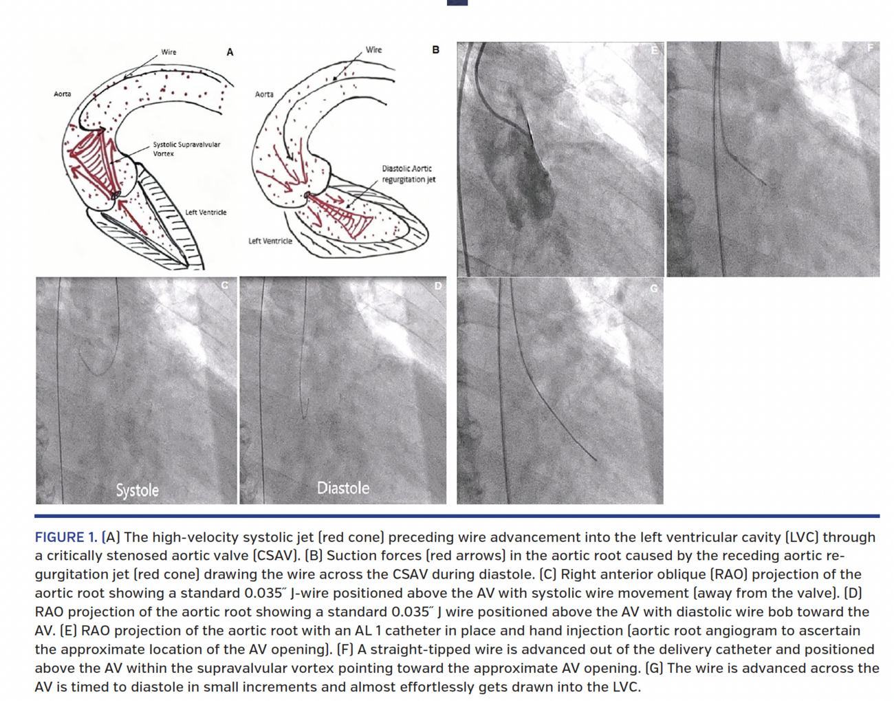 We hypothesize that aortic valve (AV) crossing is a diastolic phenomenon because the leaflets of critically stenosed AVs (CSAVs) are essentially immobile,1,2 producing not only a high-velocity systolic jet leading to a systolic supravalvular vortex (SSV) but also resulting in high-velocity diastolic jet rapidly receding into the left ventricular cavity (LVC) during diastole (Figures 1A and 1B). Thus, the more critical the stenosis, the greater the velocity of either jet,1 leading essentially to: (1) a systolic impediment to the wire crossing the AV; and (2) a strong diastolic suction drawing the wire into the LVC and potentially facilitating valve crossing.