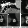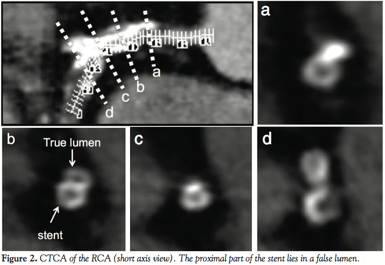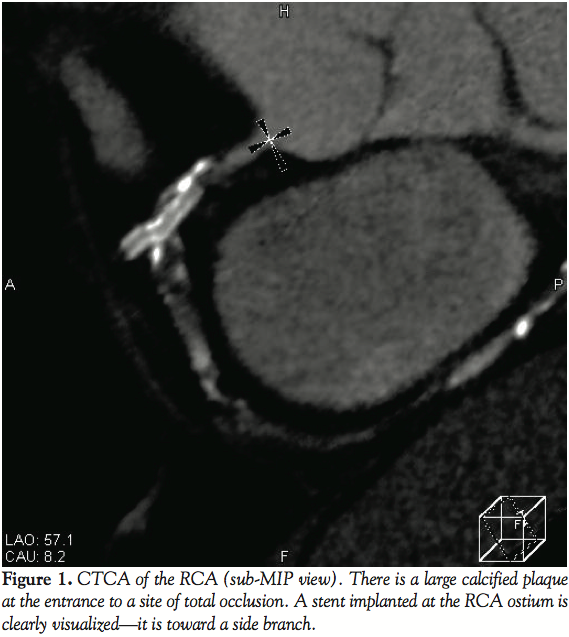 Case report. A 55-year-old male with hypertension and diabetes was hospitalized with poorly controlled typical angina pectoris in July 2008. He had a history of PCI in the right coronary artery (RCA) and coronary artery bypass grafting in 1998 when the left internal thoracic artery had been anastomosed to the obtuse marginal at another hospital. CTCA was performed with a 64-slice CT scanner (Aquilion 64, Toshiba). Scans obtained in the sub-MIP view showed a large calcified plaque at the entrance to a total occlusion of the RCA (Figure 1). The length of the CTO was about 20 mm. A stent implanted at the RCA ostium 10 years previously was also well visualized. It seemed to be misdirected toward a side branch, and the proximal part of the stent was seen to be located in a false lumen on short axis views of the RCA (Figure 2).