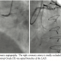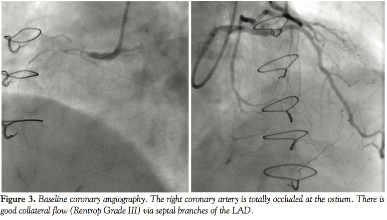 On coronary angiography (Figure 3), the RCA was totally occluded at its ostium. Selective catheterization of the left coronary artery showed retrograde filling of the RCA through a large collateral vessel (Rentrop grade III) arising from a septal branch of the left anterior descending coronary artery (LAD). Left ventriculography showed normal wall motion.