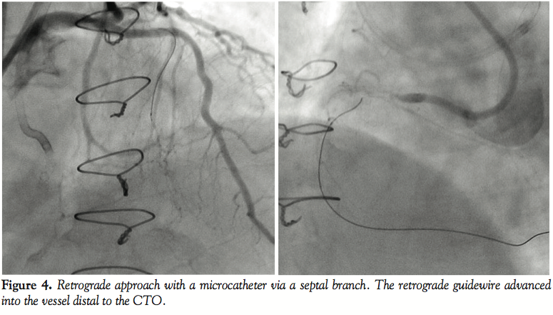 Discussion. PCI for the treatment of CTO has recently shown marked advances and the initial outcome has improved dramatically.2,3 The retrograde approach involves advancing a guidewire to cross the CTO from the distal side via a collateral vessel, and it has become more popular recently.5,6