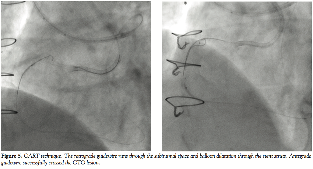 Conclusion. We reported a successful case of retrograde PCI for CTO of the RCA in which the CART technique was employed to overcome problems related to a previously implanted stent that could be visualized by CTCA.