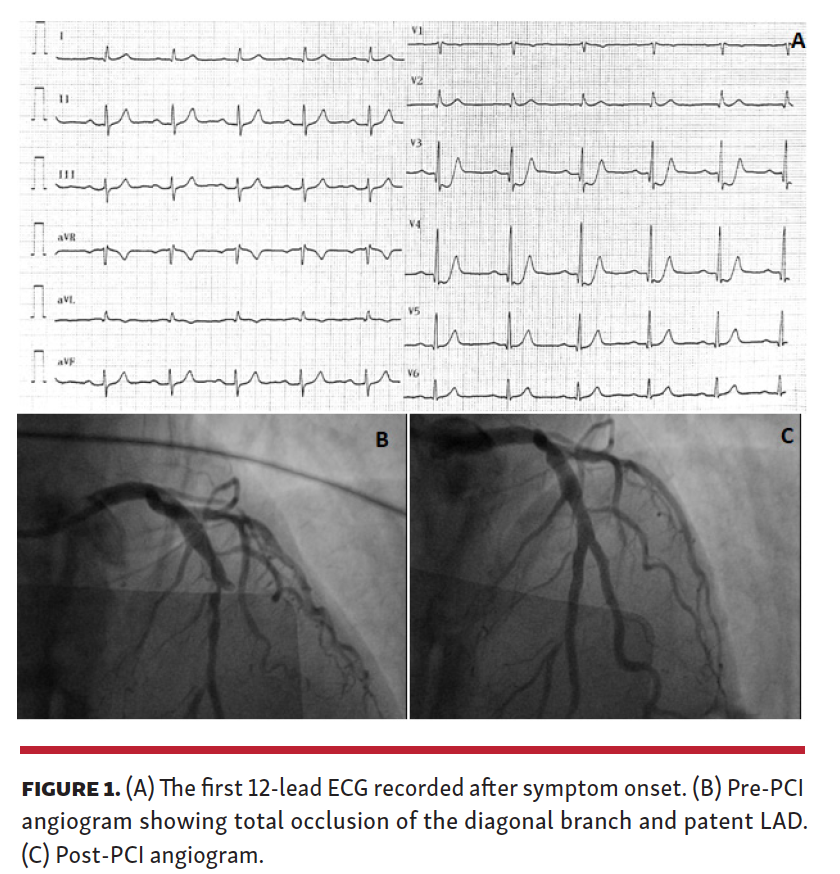 A 70-year-old man without previous cardiologic history was referred to the emergency department for an episode of ongoing chest pain during physical activity. The first electrocardiogram (ECG) showed downsloping ST-segment depression at the J-point and tall, symmetric T-waves in leads V3-V4 (Figure 1A). The first troponin I (TnI) determination was 0.18 ng/mL (normal value, <0.04 ng/mL); potassium levels on admission were completely normal. The patient underwent urgent coronary angiogram, which revealed a 75% stenosis in the left anterior descending (LAD) coronary artery and a total occlusion of a large diagonal branch (Figure 1B). Both stenoses were treated successfully with percutaneous coronary intervention (Figure 1C). Echocardiography revealed anterior free wall, septum, and apex akinesia. After reperfusion, the ECG developed negative T-waves in V2 through V6, DI, and aVL. The ECG pattern presented in this case, described in the literature as a “De Winter” pattern, is a possible manifestation of an acute anterior myocardial infarction due to LAD occlusion, with a reported incidence of 2%.